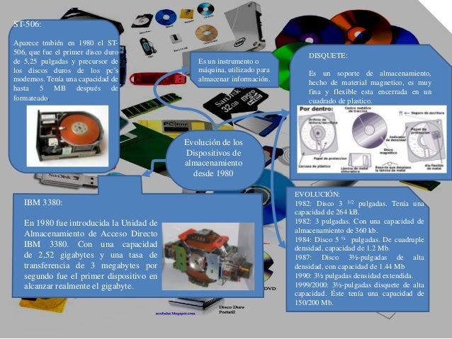 Historia y evolución de los dispositivos de almacenamiento disquete disco duro tarjeta perforada el 13 de septiembre de 1956 ibm presentó al mundo el ibm 350, el primer disco duro de la historia. Por otra parte, según juan josé muñoz, product manager de exevi, los sistemas de almacenamiento de datos están viviendo una época dorada, que ha puesto fin a más de 50 años de dominio del disco duro convencional. Un dispositivo de almacenamiento comunicacional que es capaz de almacenar datos o cualquier tipo de información. Un dispositivo de almacenamiento computacional es un dispositivo que es capaz de almacenar datos o cualquier tipo de información.