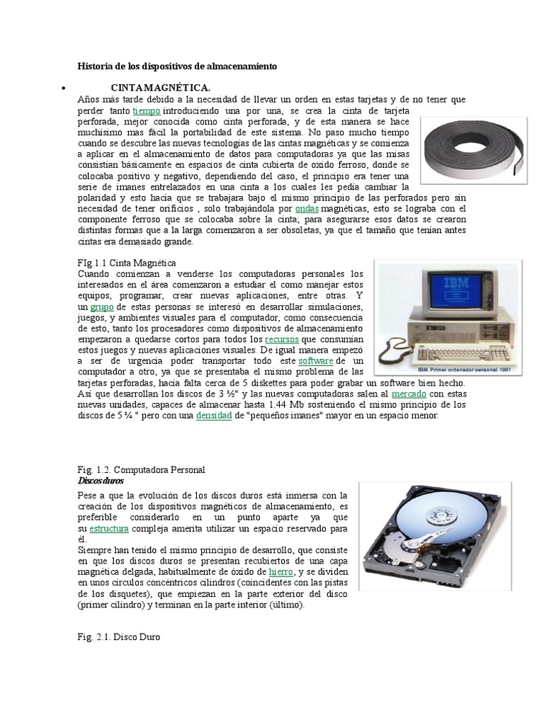 El tipo de información que se puede almacenar en las cintas magnéticas es variado, como vídeo, audio y datos.los dispositivos informáticos de almacenamiento masivo de datos de cinta magnética son utilizados principalmente pararespaldo de archivos, y para el proceso de información de tipo secuencial, como en la elaboración de nóminas de las grandes. 3/27/13 • inventada por ibm. El primer disco duro de mayor capacidad fue creado en 1980, tenia una capacidad de 1gb y el tamaño de un frigorífico. Breve historia de lo dispositivos de almacenamiento 1.