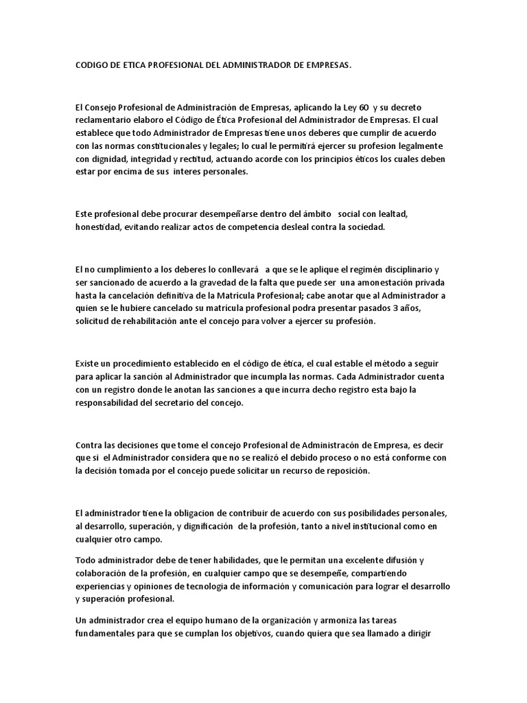 Muchos profesionales se gobiernan a sí mismos con un código de ética, en donde se dictan una serie de normas las cuales deben ser cumplidas por el profesional. El consejo profesional de negocios internacionales, en uso de sus atribuciones legales y, considerando que en la ley 556 de febrero 2 de 2000, diario oficial no. 43.883 del 7 de febrero de 2000, se establece. La comunidad, los clientes, empleadores y los colegas.